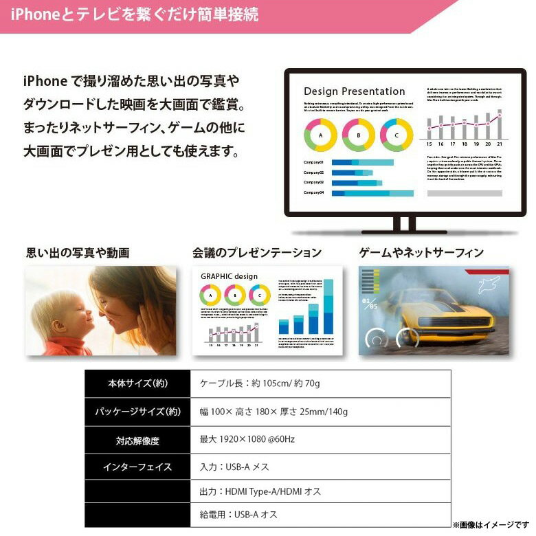 iPhone や Pad などのデバイス の映画、テレビ 番組、ユーチューブ、ゲーム、オーディオ、写真、ビデオ、アプリケーション、 プレゼンテーション、Web サイト、スライドなどを最大1080pのHD画質でテレビ、?モニター、投影型スクリーン、またはHDMIポートが搭載するディスプレイに同期して表示できます。