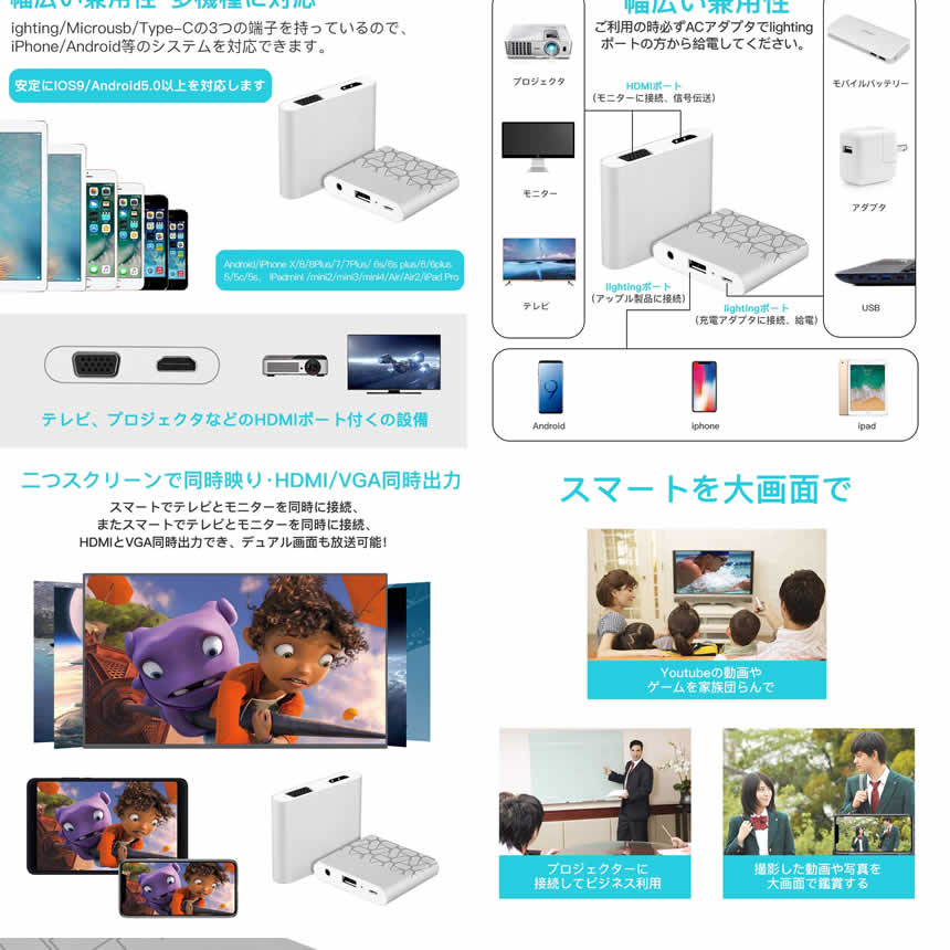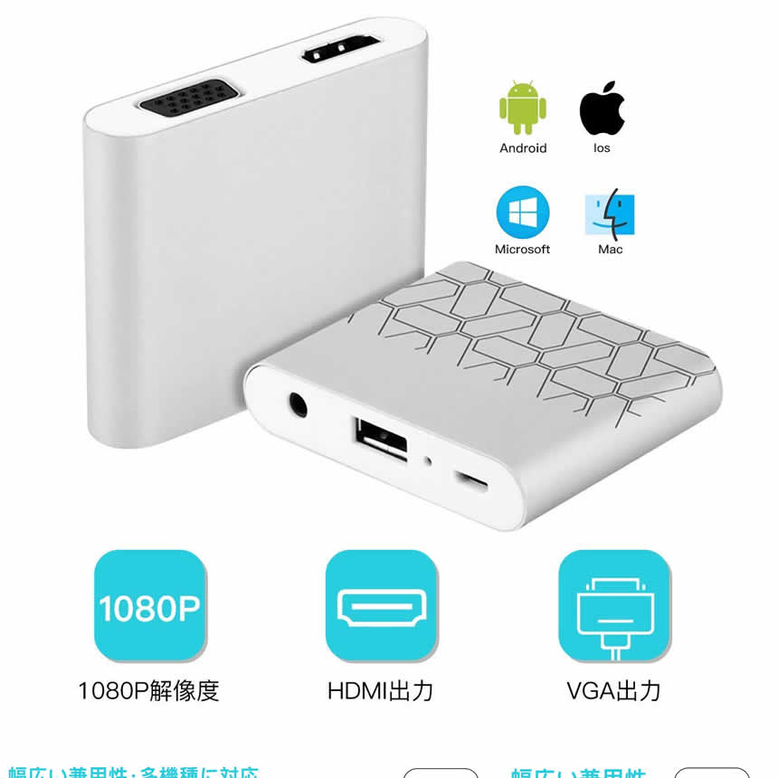 ■商品説明■ YOUTUBEなどの画像を大画面で高画質で楽しめる iPhone/iPad/iPod/Androidなどで撮影した映像をスクリーンで楽しめる 携帯ゲームをテレビで大画面で楽しめる 車の中で動画・映像・アプリをもっと楽に楽しめる 重いパソコン要らないで、会議で簡単にプレゼンテーションをテレビで同僚に表示できる 出力電流:5V/1A 材質:アルミニウム合金+ABS 適用設備:スマート/タブレット 兼用機種:iPhone/Android/Type-C 作業温度:0℃〜45℃ 作業湿度:10%〜85%RH 保存温度:−10℃〜50℃ 保存湿度:5%〜90%RH カラー:シルバー 解像度:1080P 重量:約100g サイズ:64.5*53*14mm 送料無料【クレジット決済のみ】 ※北海道は+215円、離島地域及び沖縄県は2000円にて承ります。