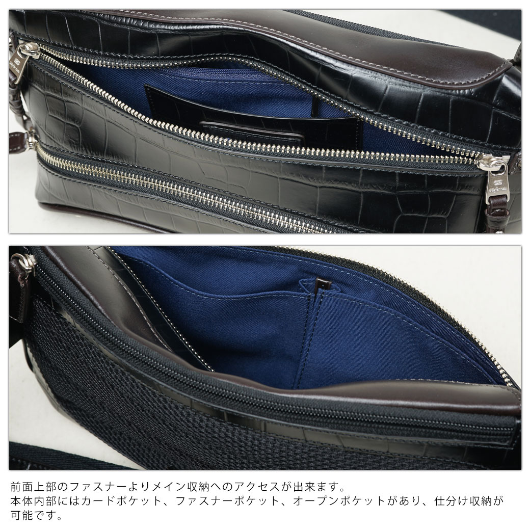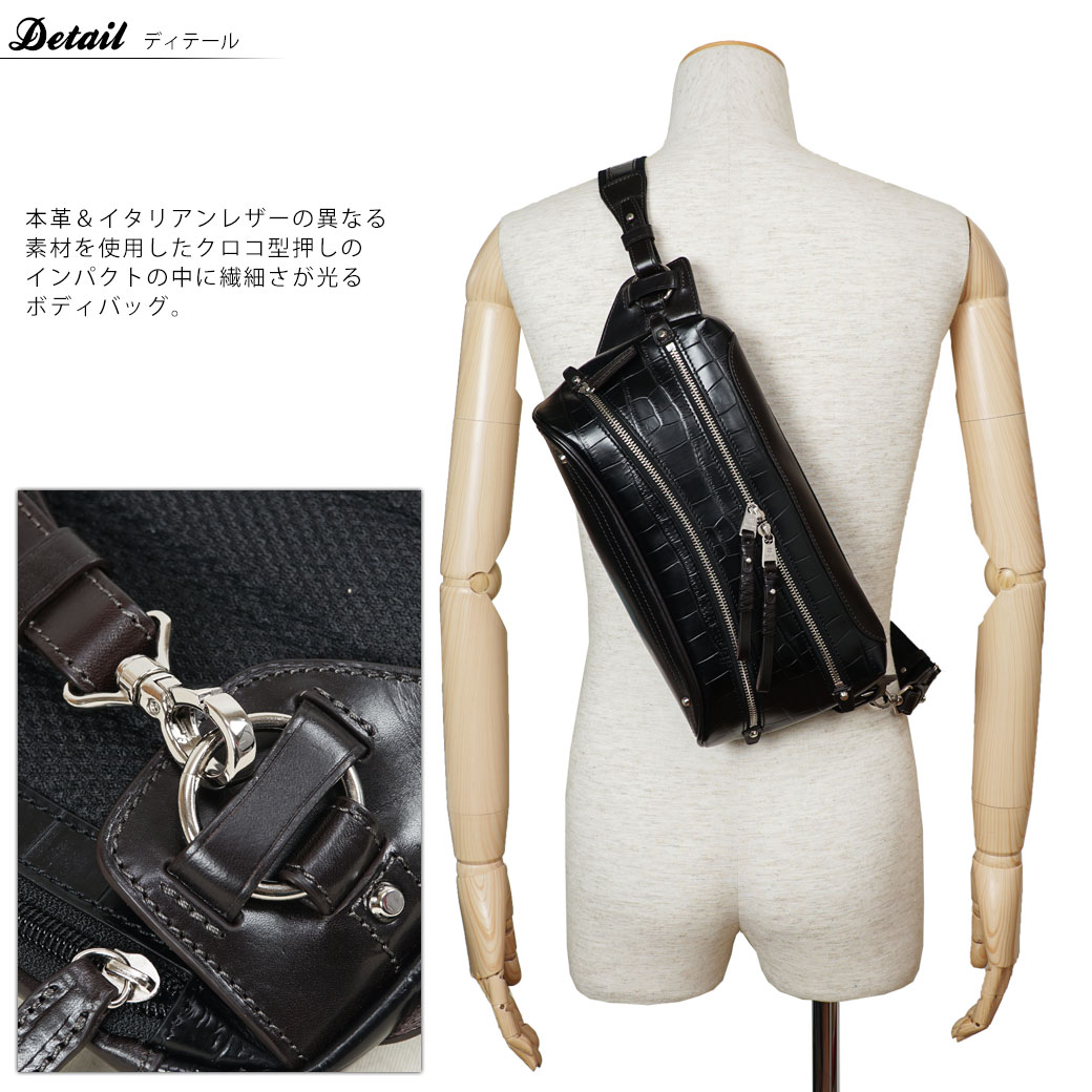 本革&イタリアンレザーの異なる素材を使用したクロコ型押しのインパクトの中に繊細さが光るボディバッグ。