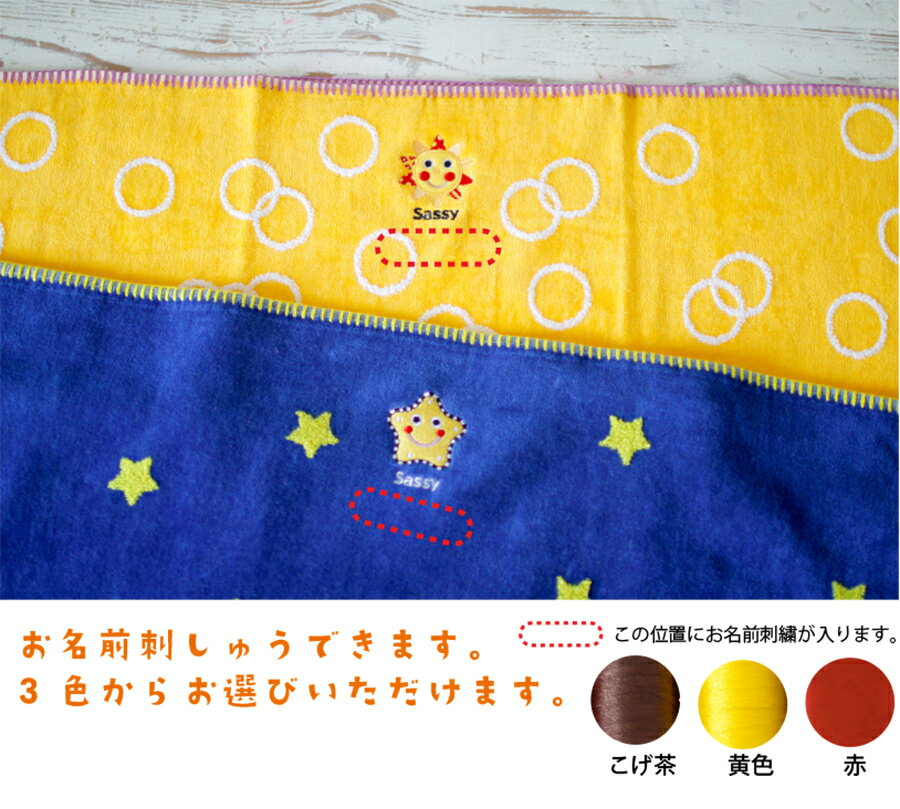 スター(ブルー)は黄色、サン(イエロー)はピンクのステッチがとってもかわいい! 贈りものに、ラッピングもお承りしています 入園のお祝い、進級のお祝い、お誕生日やお返しにも人気です。
