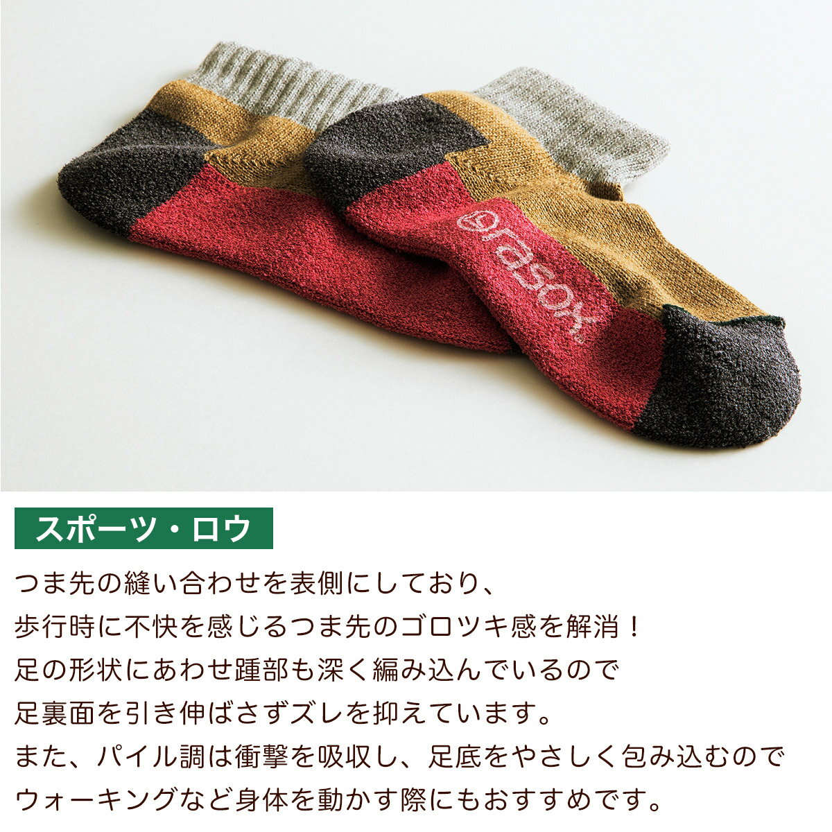 L字型一体成型靴下の 特許取得済 MADE IN JAPAN ■カラーバリエーション ※画像クリックで拡大画像をご覧いただけます <227 イエロー×ブラック> <441 ターコイズ×レッド> <627 ベージュ×ブルー> <732 グレー×グリーン> ■商品詳細 商品名 rasox ラソックス スポーツ・ロウ カラー 4カラー サイズ S(22-24cm)、M(24-26cm)、L(26-28cm) 素材 アクリル、綿、その他 原産国 日本製